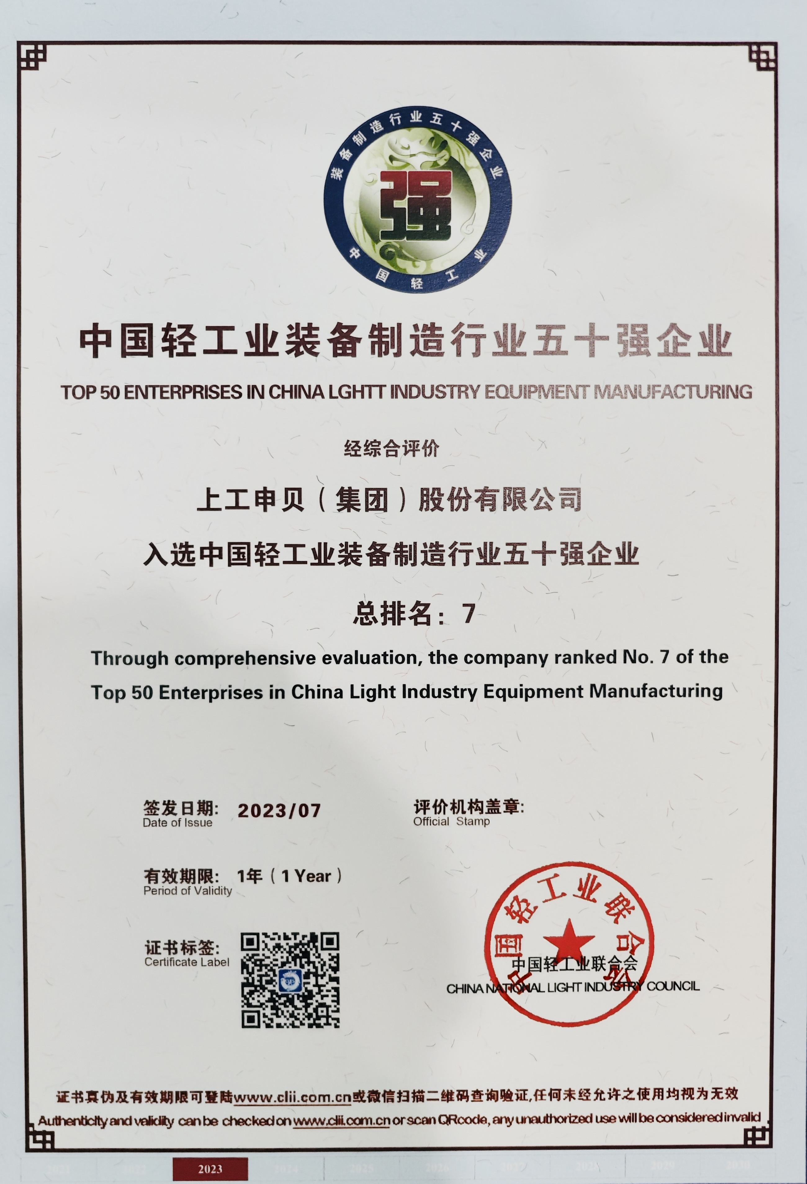 公海彩船6600集团入选中国轻工业装备制造行业五十强企业